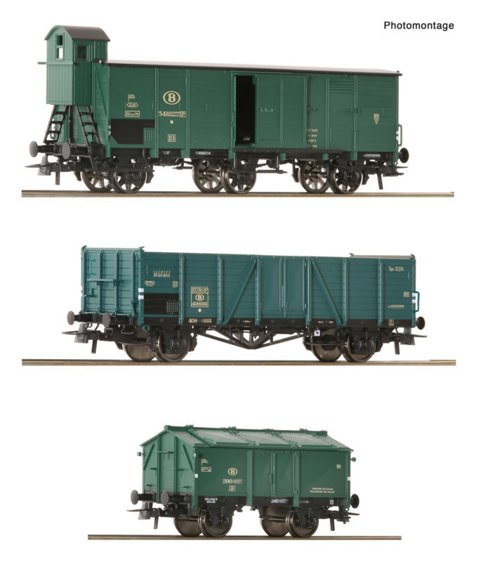 OverzichtWagenset met drie goederenwagens van de Belgische Staatsspoorwegen.