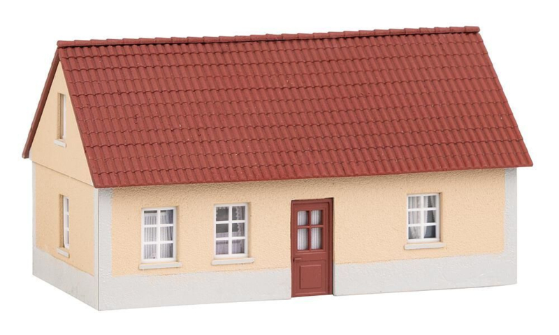OverzichtIdeaal voor beginnende modelbouwers. Lichtkleurig gepleisterde, gelijkvloerse woning met pannendak en schoorsteen. De plinten en randen van het gebouw in contrasterende kleur.