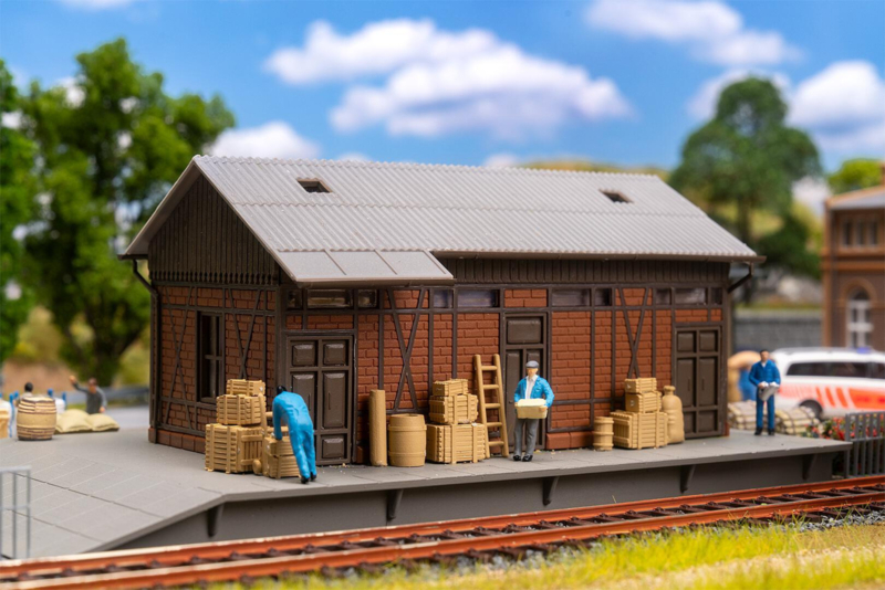 OverzichtDeze actieset tovert elk station om tot een authentiek goederenverwerkingscentrum! Het zandkleurige, bakstenen administratiegebouw houdt de boel op orde, terwijl de goederenloods met rode bakstenen muren dient als tijdelijke opslagplaats voor de goederen. Een eenvoudige houten loods, een transformatorhuisje en een dieseltankstation ronden de scène af - perfect voor sfeervolle logistiek in miniatuur. Inhoud: Goederenloods, magazijn, dieseltankstation, transformatorhuisje, administratiegebouw, decoratie (vaten, stoffen zak, pallets, houten krat)