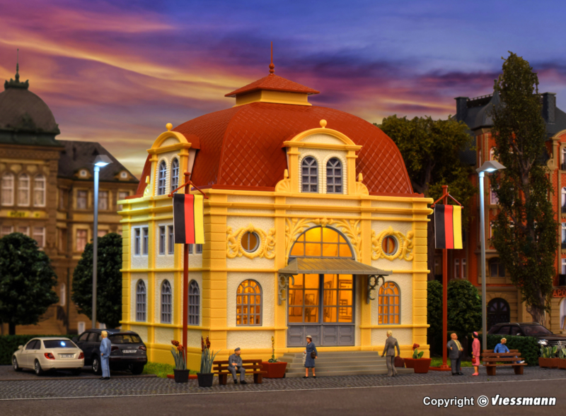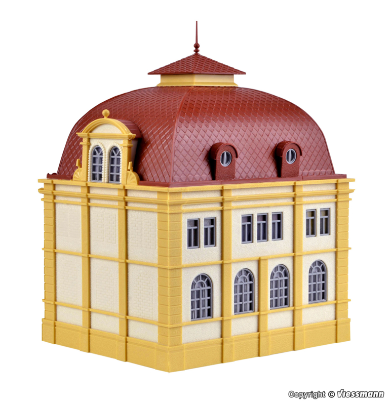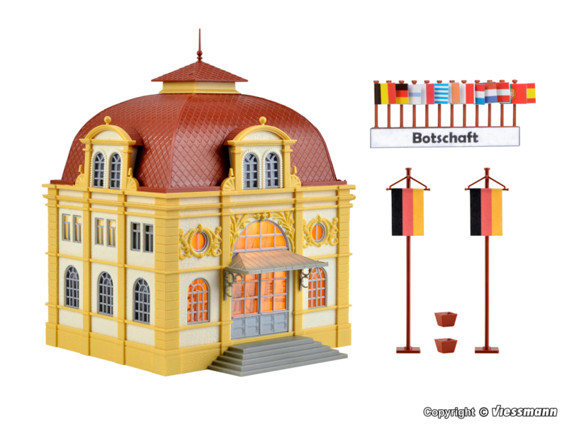 Dit imposante gebouw dient als ambassade. Bij de bouwset wordt de praktische en variabele binnenverlichting voor verdiepingen van Viessmann meegeleverd. Deze biedt onbeperkte mogelijkheden voor individuele verlichting van gebouwen met grote raampartijen. Afmetingen: L 12,6 x B 12,5 x H 16,7 cm.