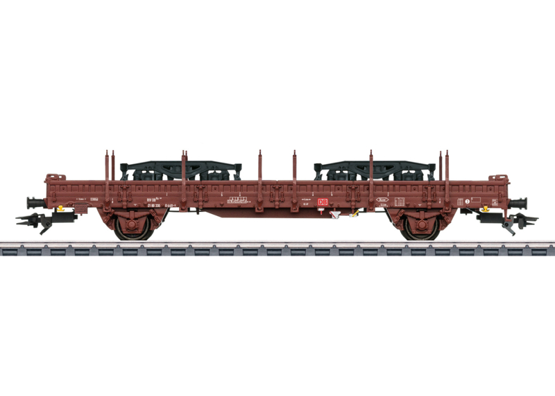 Model: Uitvoering zonder remmersbordes en met korte rongen aan de fronten. Met los gemonteerde reminrichting, rem-bedieningshendels en draaibare rongen. Met imitatie houten laadvloer. Met openingen om de meegeleverde rongen te plaatsen aan de fronten. Bufferhoogte volgens NEM. Met rechthoekige bufferschotels. Een ladinghouder voor de draaistellen wordt meegeleverd. Lengte over de buffers 15,8 cm. Set geïsoleerde wielen E700580.