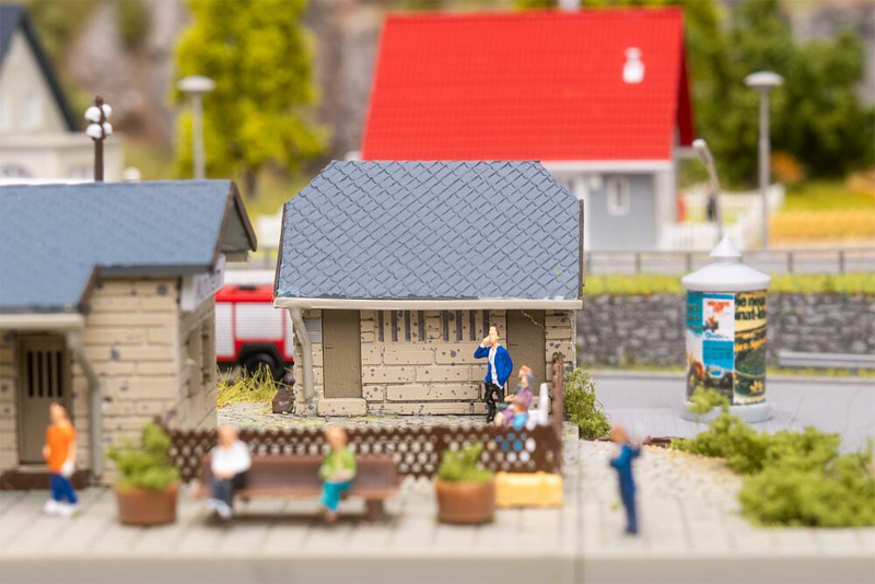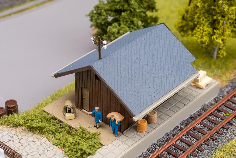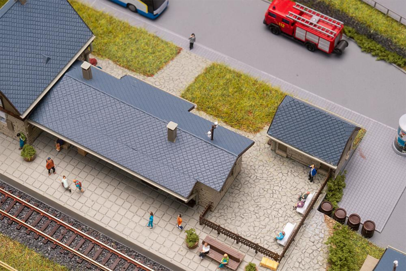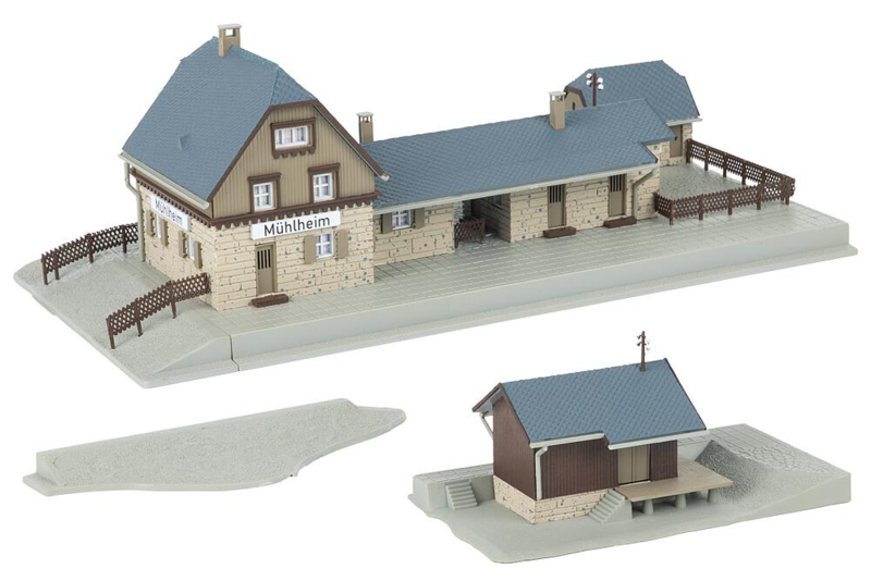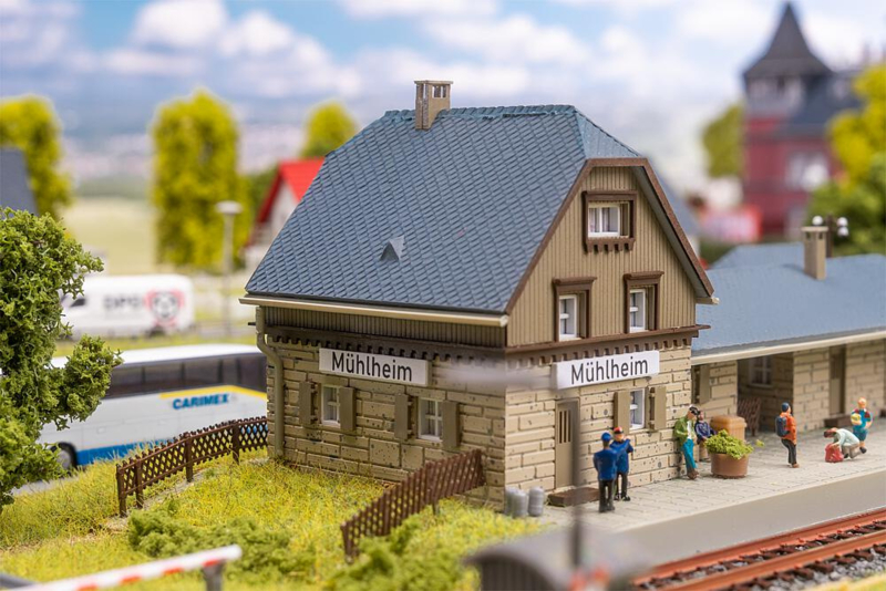 OverzichtDe volgende trein rolt rustig het station binnen en de miniatuurreizigers stappen verwachtingsvol in. Het station van Mühlheim met zijn stenen funderingen, lichtgekleurde houten gevel en grijze pannendak brengt een reissfeer in de modelwereld. Een kleine houten opslagloods maakt het geheel compleet.