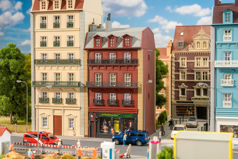 OverzichtDit typische roestrode dorpshuis, dat zich uitstrekt over vier verdiepingen, is een genot met zijn elegante zwarte metalen balustrades en een schoenmakerij op de begane grond. Het is de perfecte aanvulling op elke huizenrij en voegt een charmante, stedelijke flair toe aan je miniatuurstadslandschap.