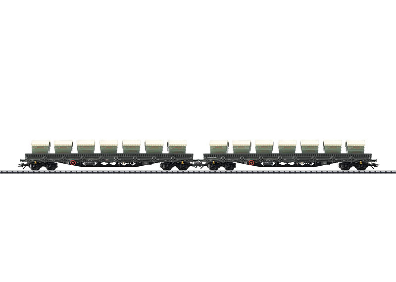Model: Lageboordwagen met draaistellen type Y 25. Metalen inzetten voor goede loopeigenschappen. Specifieke uitvoering van de ondervloer, met moerbalk en trapeziumvormige uitsparingen. Veel gemonteerde details. Elke wagen is beladen met 7 bakken. 2-delige uitvoering met bak en dekkleed. Beide wagens met verschillende bedrijfsnummers. Alle bakken met verschillende baknummers. Elke wagen met bakken afzonderlijk verpakt. Extra buitenverpakking.