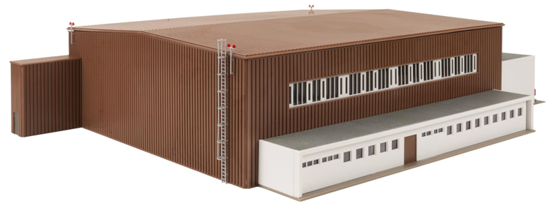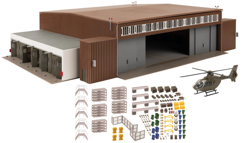OverzichtRuim halgebouw met voertuigoverkapping aan de zijkant, met vouwdeuren, personeels- en opslagruimten aan de achterkant, schuifdeuren die over de hele voorkant van de hal geopend kunnen worden en daklichten. Bijpassende binneninrichting zoals rekken, tafels en stoelen, kluisjes en nog veel meer zijn inbegrepen in het bouwpakket. Een standmodel van een multifunctionele helikopter gemodelleerd naar het type »EC135« van de fabrikant »Airbus«, dat door de Duitse Strijdkrachten wordt gebruikt voor trainingsdoeleinden.