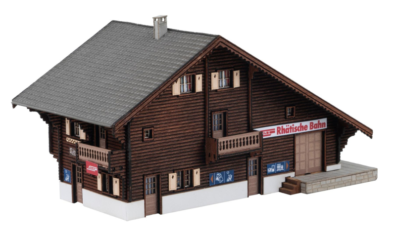 OverzichtAan de historische Arosa-spoorlijn in Zwitserland, die al sinds 1914 door adembenemende landschappen rijdt, is het historische station »Litzirüti« de laatste halte in Schanfig op weg naar Arosa. Geïnspireerd door het origineel straalt het model met zijn donkere houten lambrisering en lichtgekleurde luiken de charme van vervlogen tijden uit. Het diepe dak van grijze dakpannen bekroont het station. Het gebouw harmonieert perfect met de omringende natuur en nodigt miniatuurreizigers uit om even te pauzeren op hun reis en is perfect om de modelspoorbaan uit te breiden.